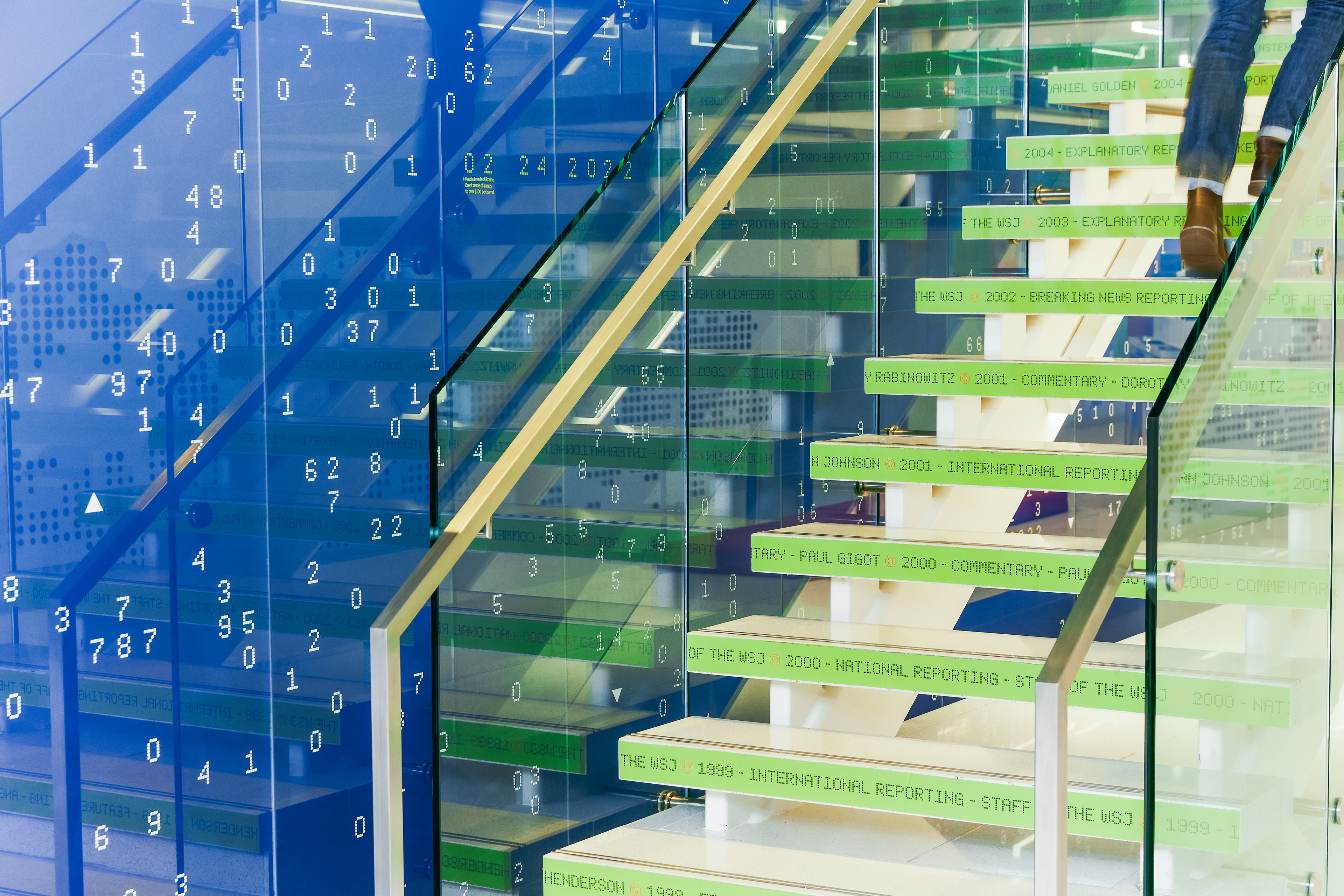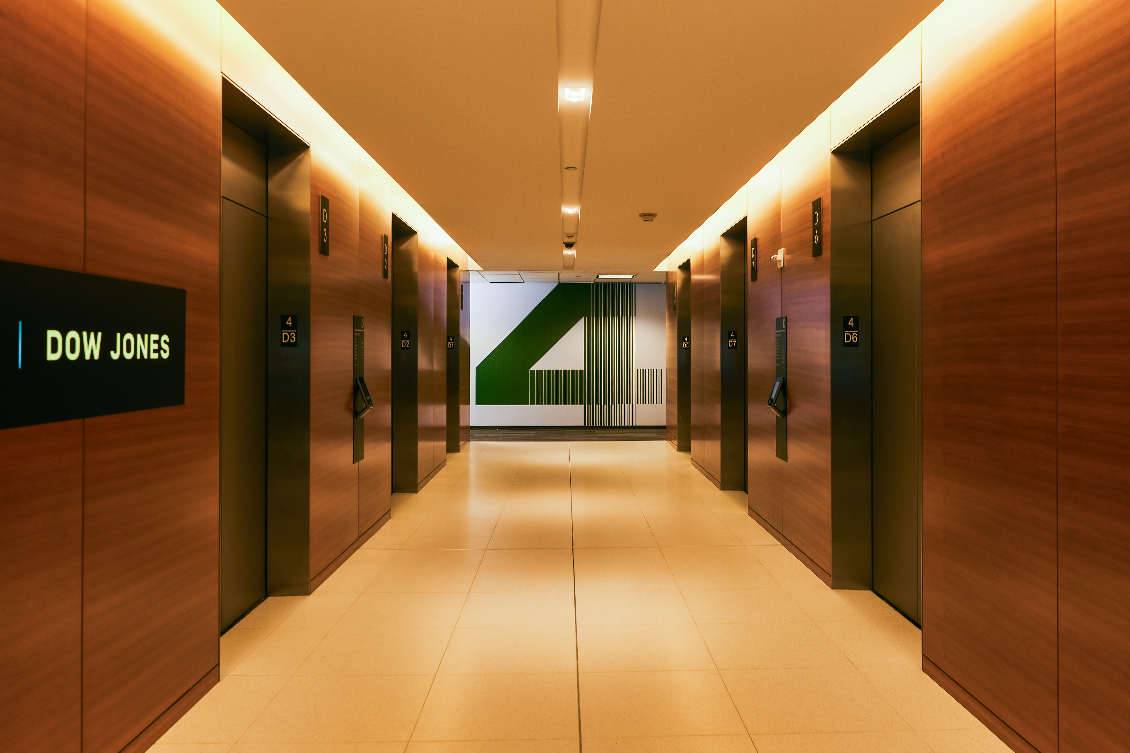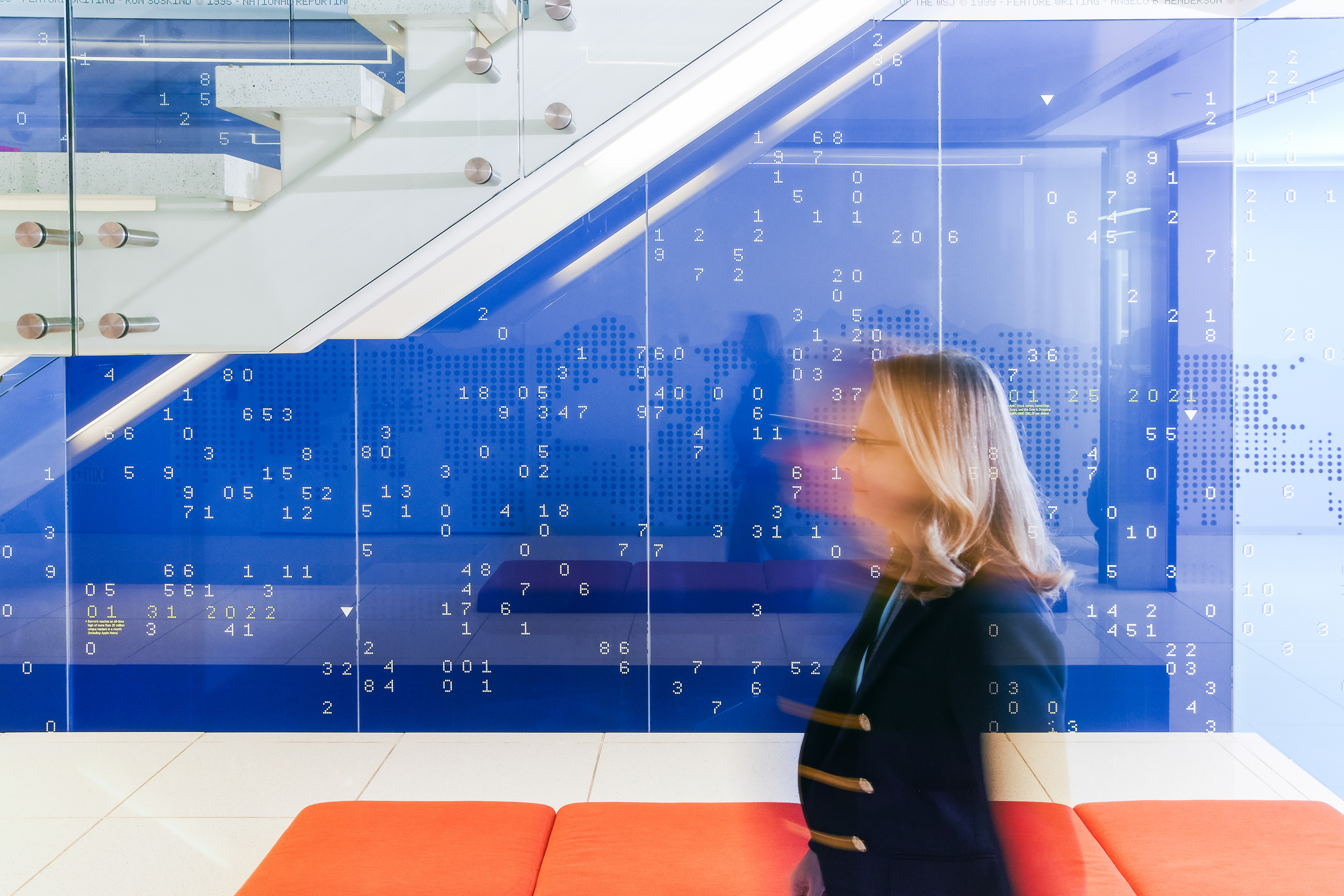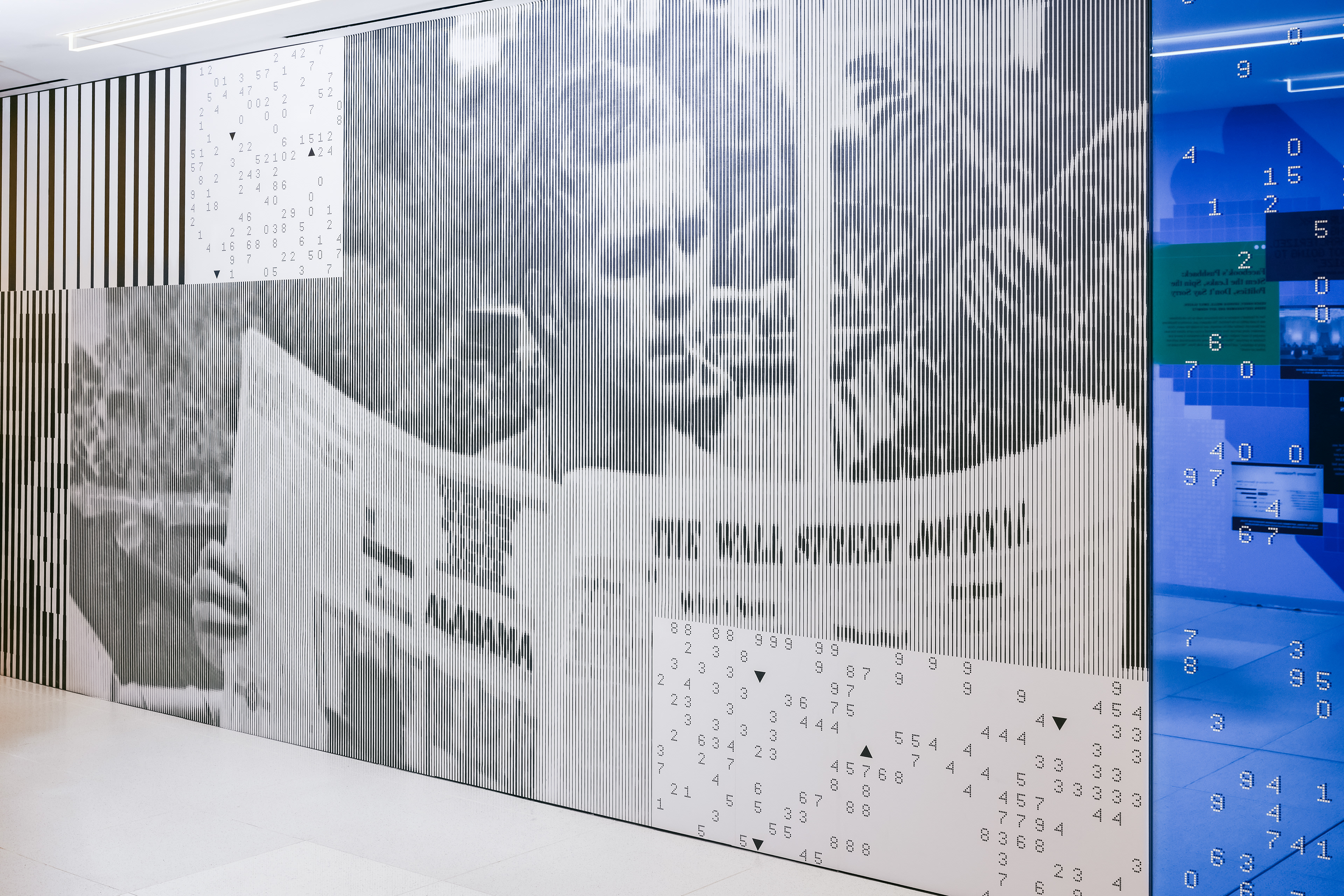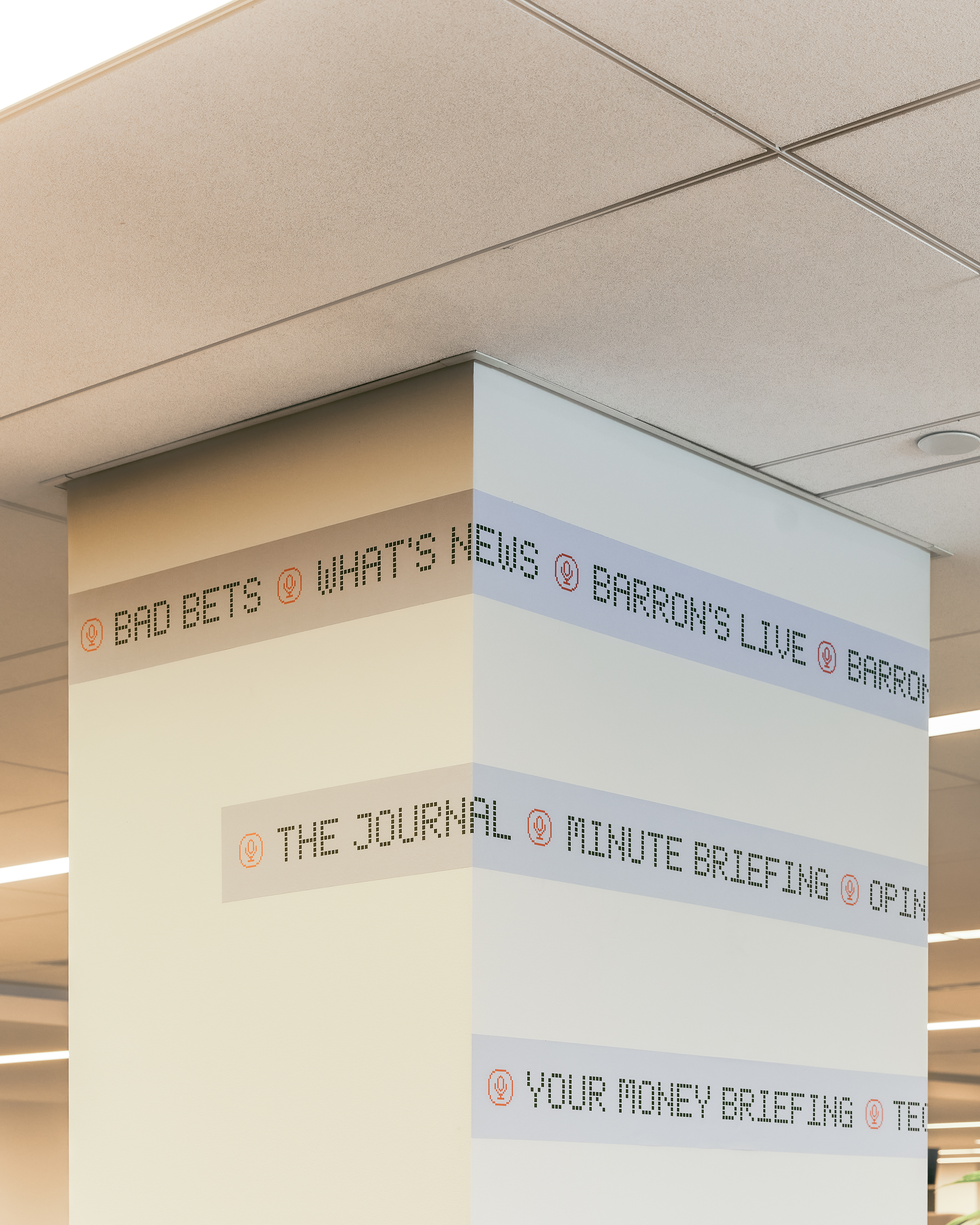 Dow Jones and The Wall Street Journal needed an updated office space that reflected their brand’s evolution and future. Collaborating with their team, we transformed journalism into immersive visual experiences, merging market data with storytelling. Dynamic installations showcased groundbreaking reporting, using code to generate imagery from market indicators—graphs, ticker tape, currency symbols, and numerical data—translating finance’s abstract language into compelling visuals. These design-forward elements invited engagement, reinforcing the connection between market movements and world events while uniting the marketing team’s work with the broader organization.
