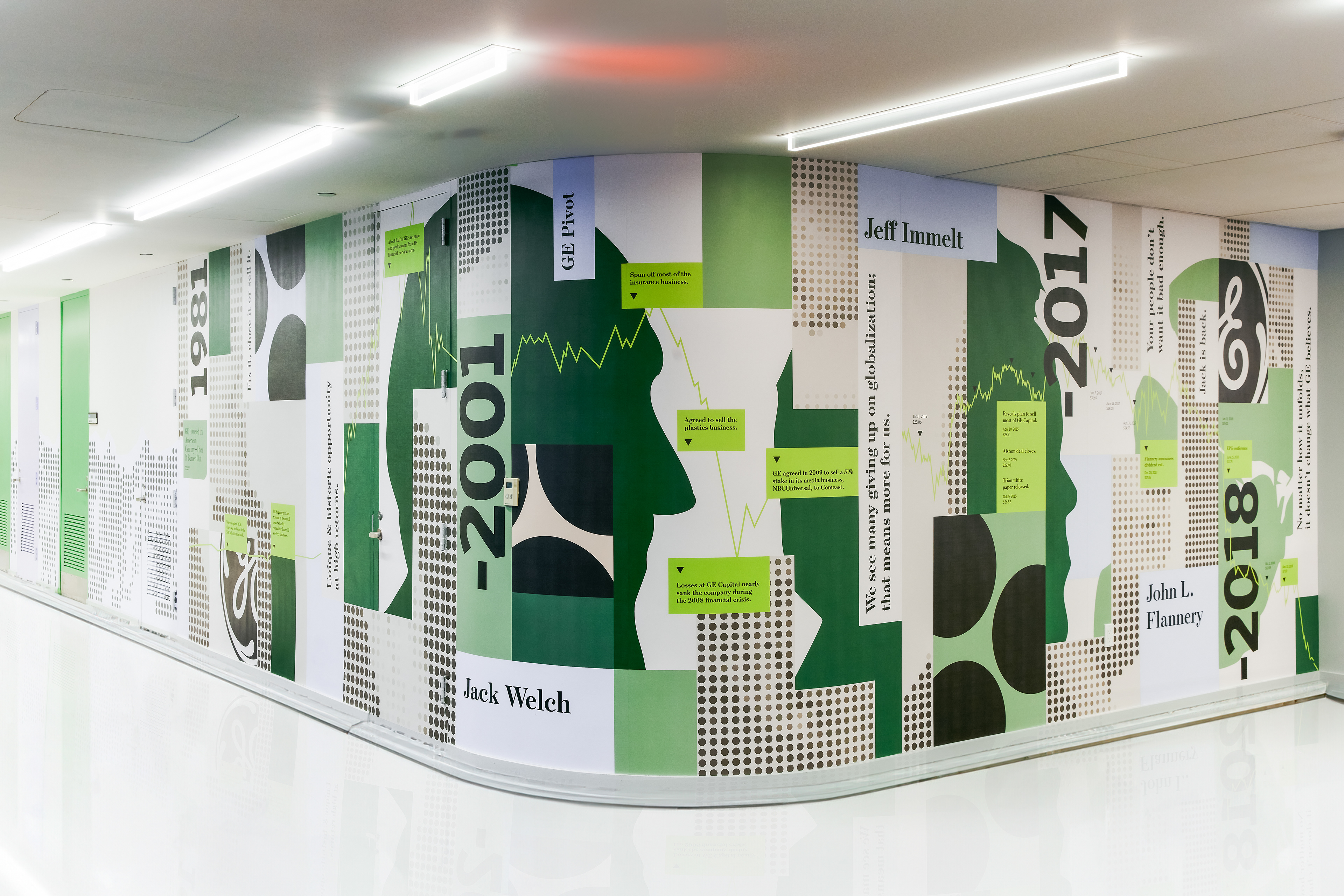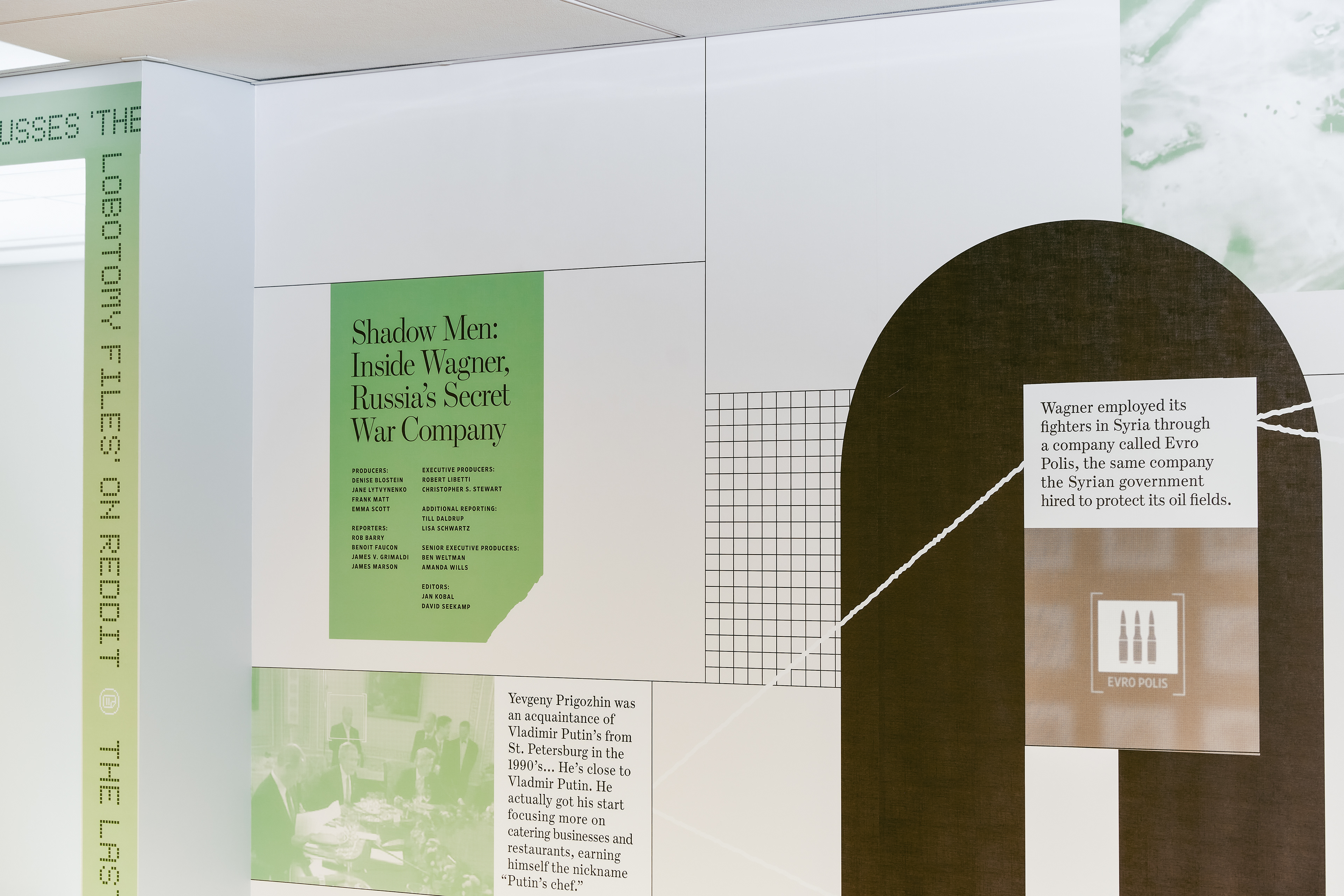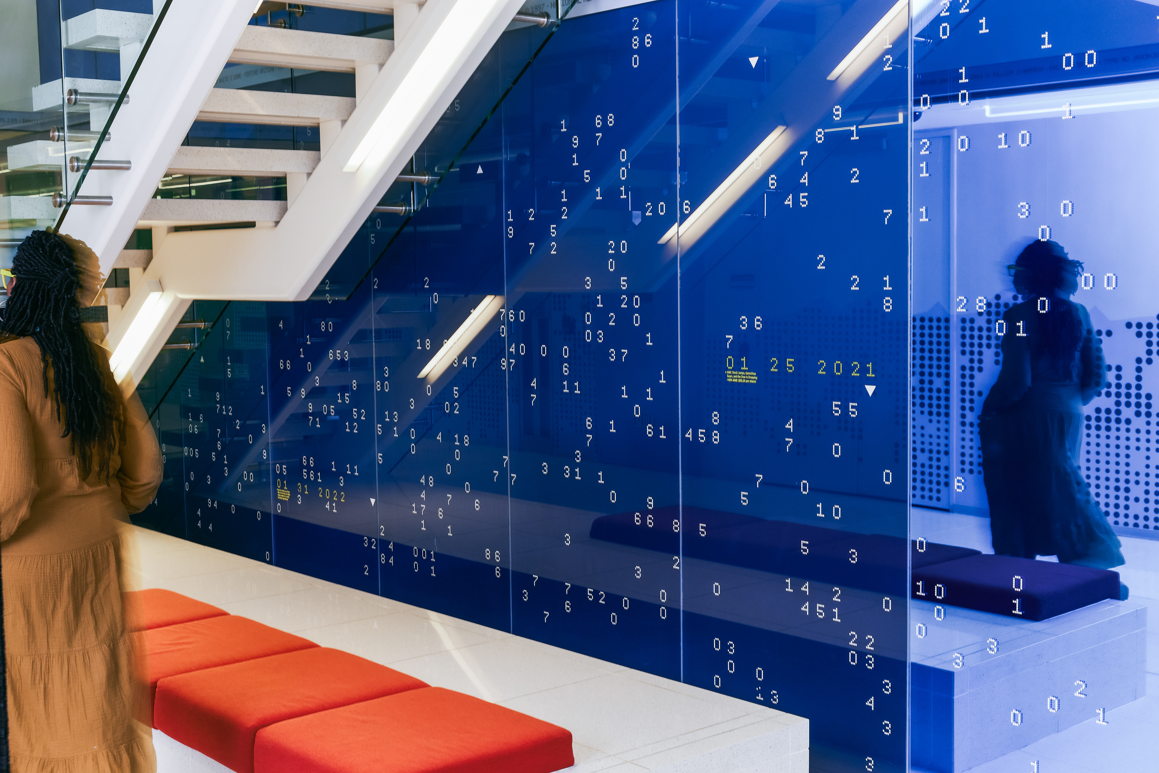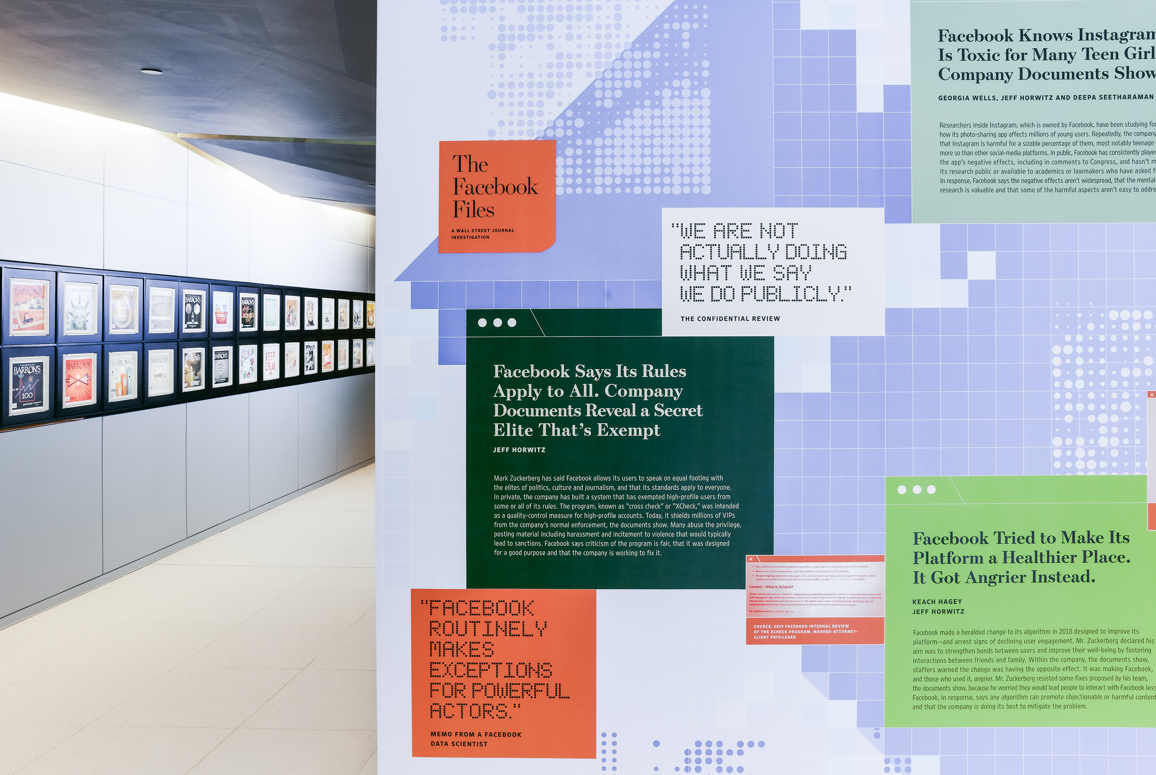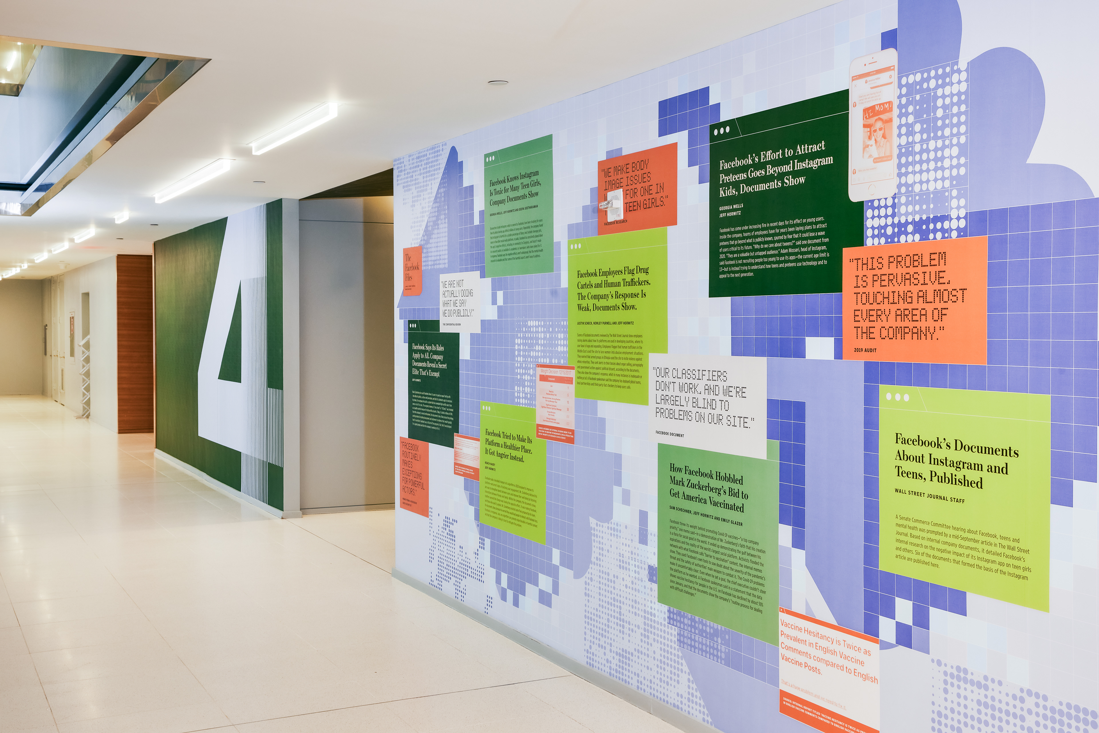 Dow Jones and The Wall Street Journal needed an updated office space that reflected their brand’s evolution and future. Collaborating with their team, we transformed journalism into immersive visual experiences, merging market data with storytelling. Dynamic installations showcased groundbreaking reporting, using code to generate imagery from market indicators—graphs, ticker tape, currency symbols, and numerical data—translating finance’s abstract language into compelling visuals. These design-forward elements invited engagement, reinforcing the connection between market movements and world events while uniting the marketing team’s work with the broader organization.